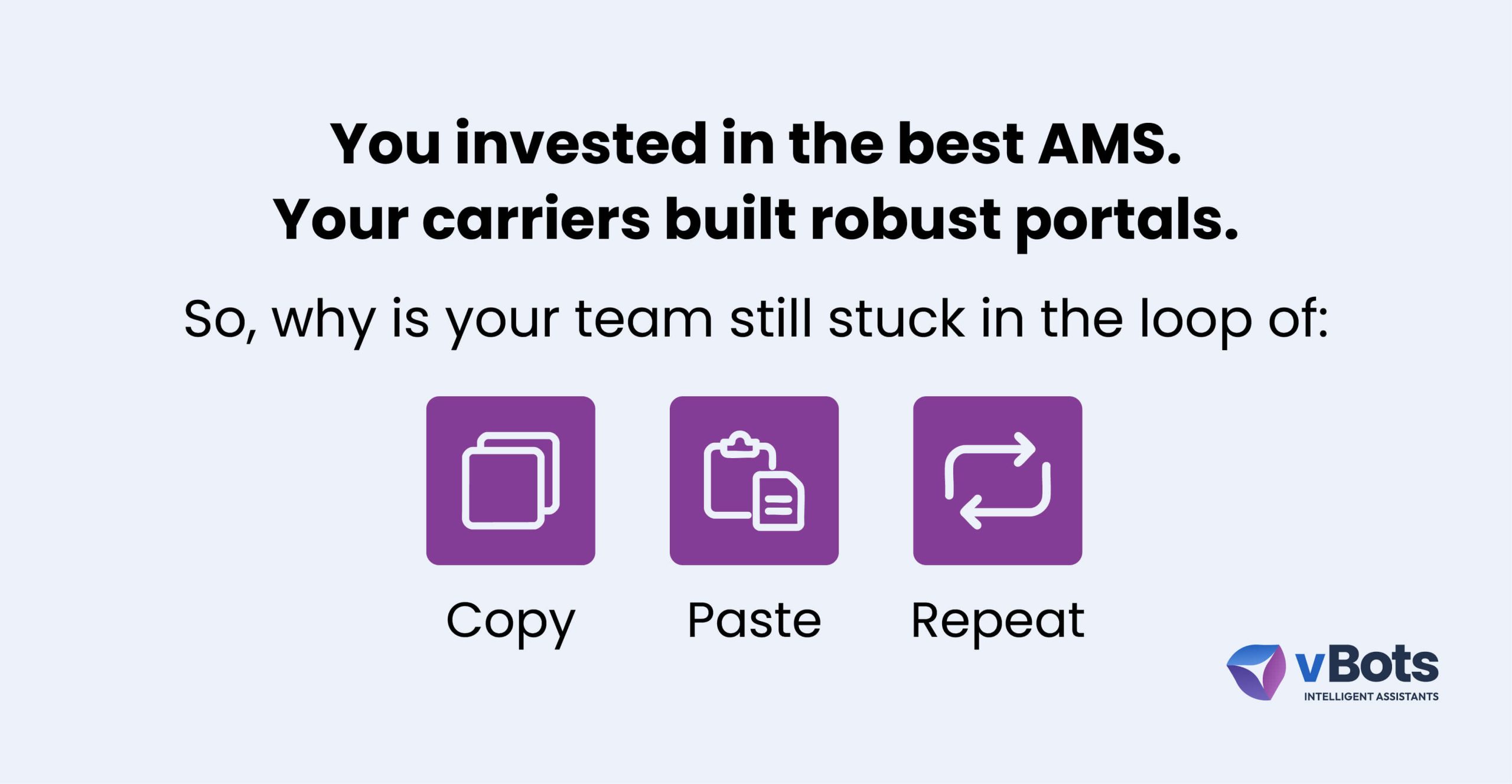 vBots offers a “intelligent workforce” that interacts with AMS and carrier portals exactly like a human does, but at machine speed and with precision.